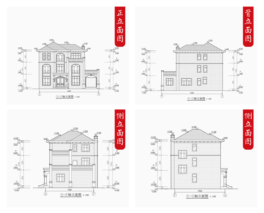 建筑立面圖:東立面圖,西立面圖,南立面圖,北立面圖,剖面圖;