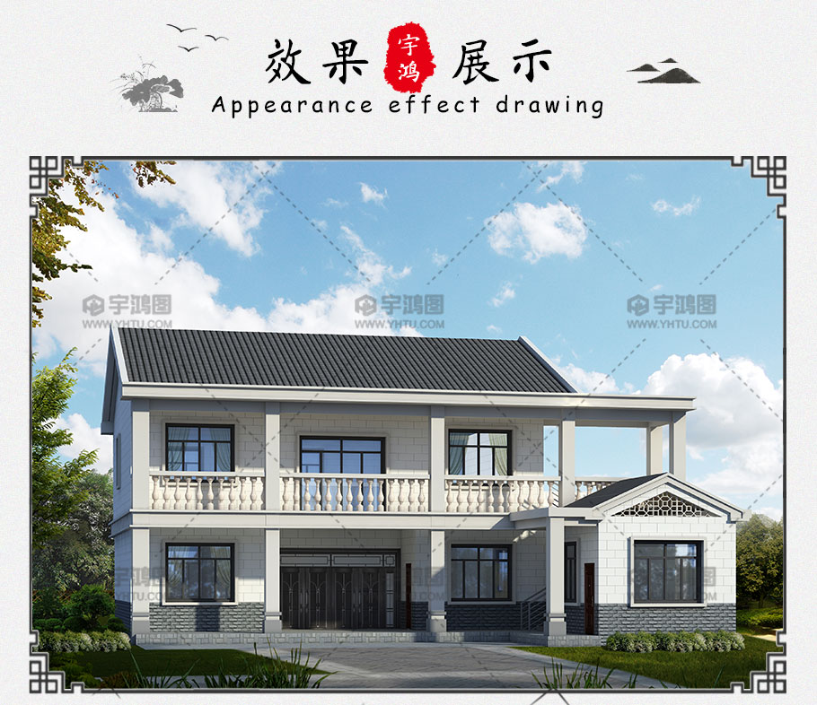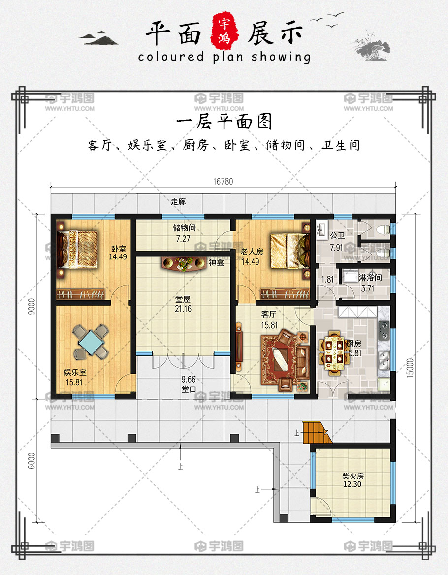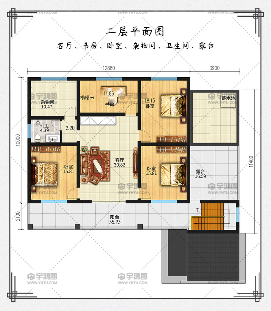 帶柴火房二層中式農村房屋設計圖,設有堂屋和神龕。一層東南角設有12.3平方米柴火房,從堂口前方進入帶神龕的獨立堂屋,堂口右側連接客廳,老人房位于客廳上方,儲物間東側與老人房相連,又與北側走廊相連。堂屋左側有一個娛樂室和臥室。客廳右側有16平米廚房餐廳通間,還有淋浴間和公衛。二層有3個臥室,一個客廳,一個書房,一個儲物間。外帶一個蓄水池,35.2平米大陽臺和16.6平方米露臺,此款是農村人鐘愛的戶型設計圖。