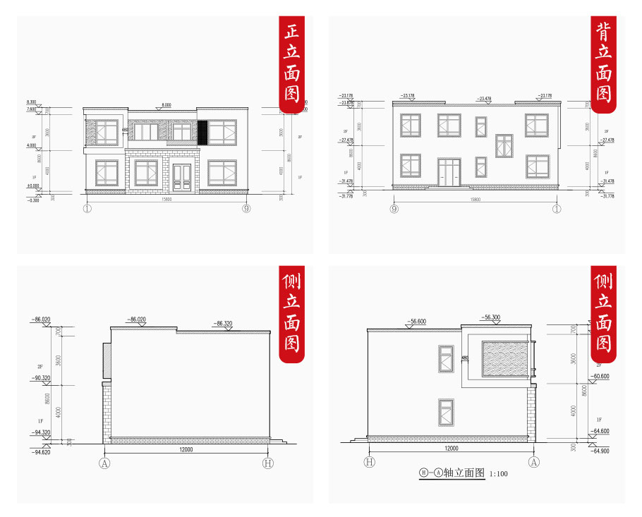 建筑圖: | 建筑平面圖:一層平面圖,二層平面圖; 建筑立面圖:東立面圖,西立面圖,南立面圖,北立面圖,剖面圖; 大樣圖:樓梯詳圖,細部大樣,門窗大樣 |