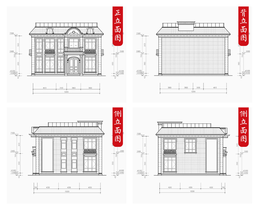 建筑圖: | 建筑平面圖:一層平面圖,二層平面圖; 建筑立面圖:東立面圖,西立面圖,南立面圖,北立面圖,剖面圖; 大樣圖:樓梯詳圖,細部大樣,門窗大樣 |
