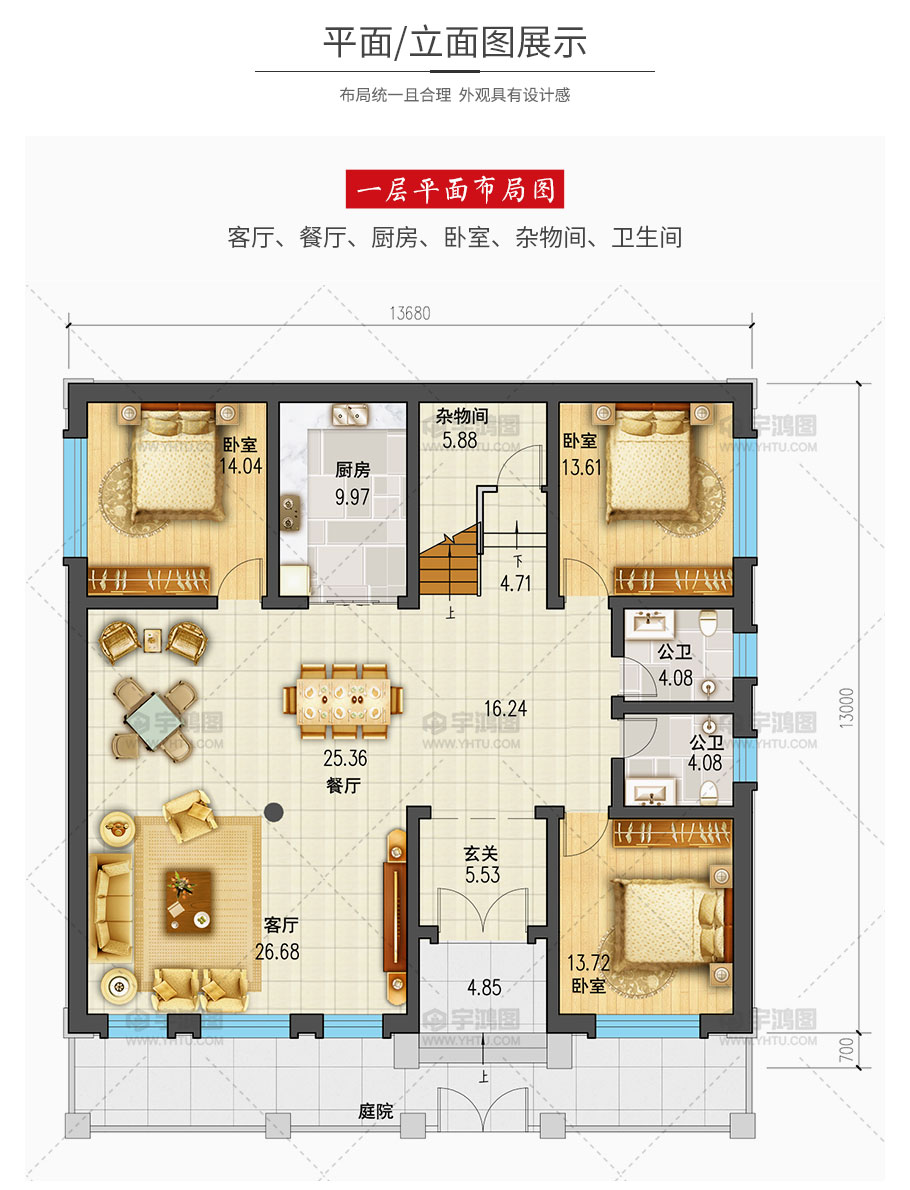 開間:13.68米 | 進深:13.7米 | 占地面積:173平方米 | 建筑面積:354.3平方米 |