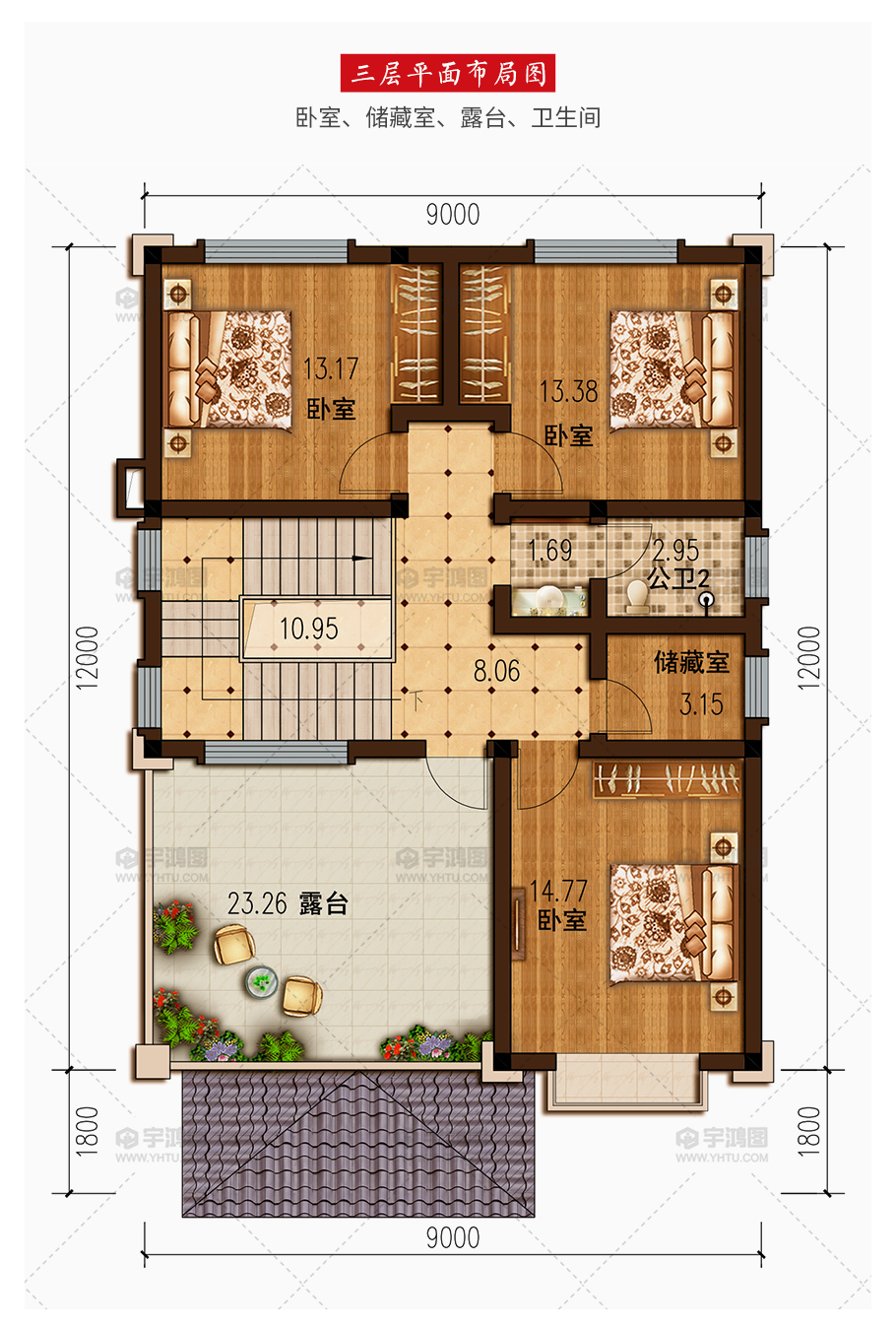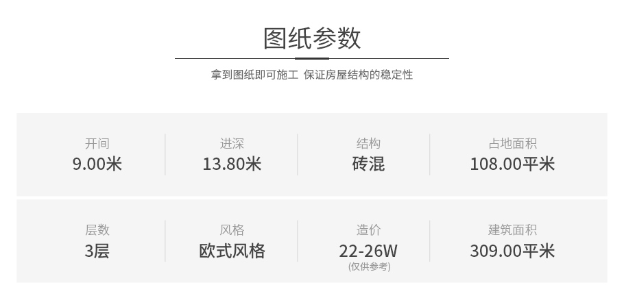 開間:9米 進深:13.8米 占地面積:108平方米 建筑面積:309平方米