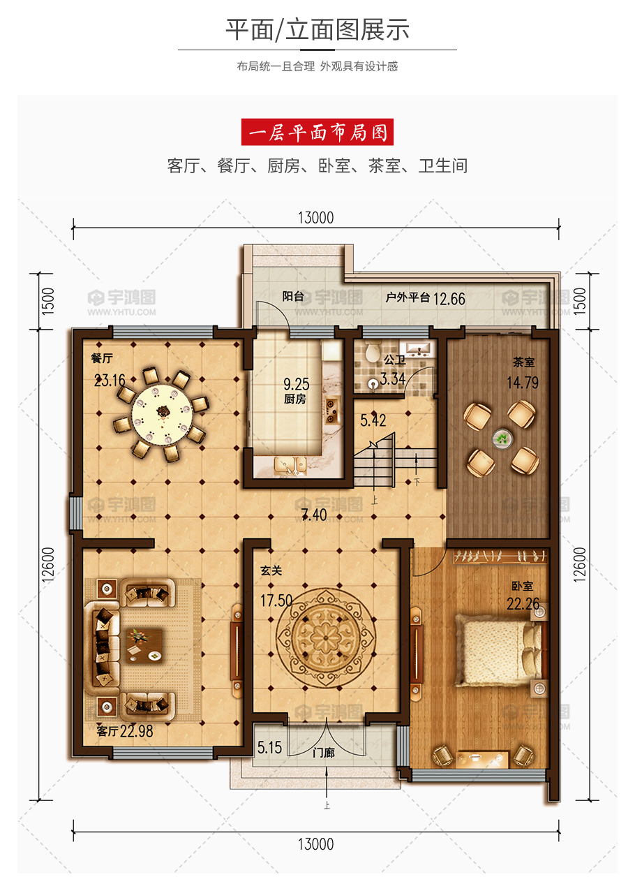 開間:13米 | 進深:14.1米 | 占地面積:147.2平方米 | 建筑面積:399.1平方米 |