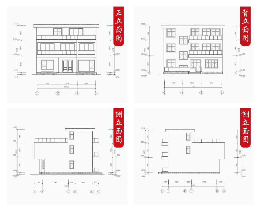 建筑圖: | 建筑平面圖:一層平面圖,二層平面圖; 建筑立面圖:東立面圖,西立面圖,南立面圖,北立面圖,剖面圖; 大樣圖:樓梯詳圖,細部大樣,門窗大樣 |