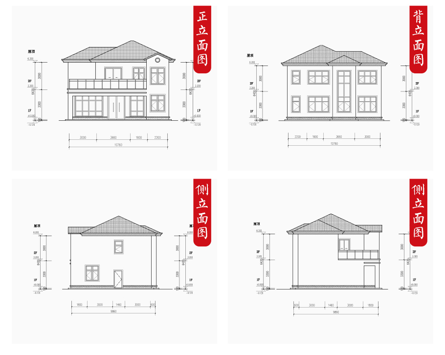 建筑立面圖:東立面圖,西立面圖,南立面圖,北立面圖,剖面圖;