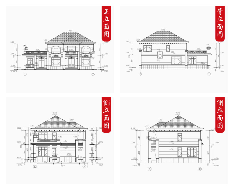 建筑圖: | 建筑平面圖:一層平面圖,二層平面圖; 建筑立面圖:東立面圖,西立面圖,南立面圖,北立面圖,剖面圖; 大樣圖:樓梯詳圖,細部大樣,門窗大樣 |