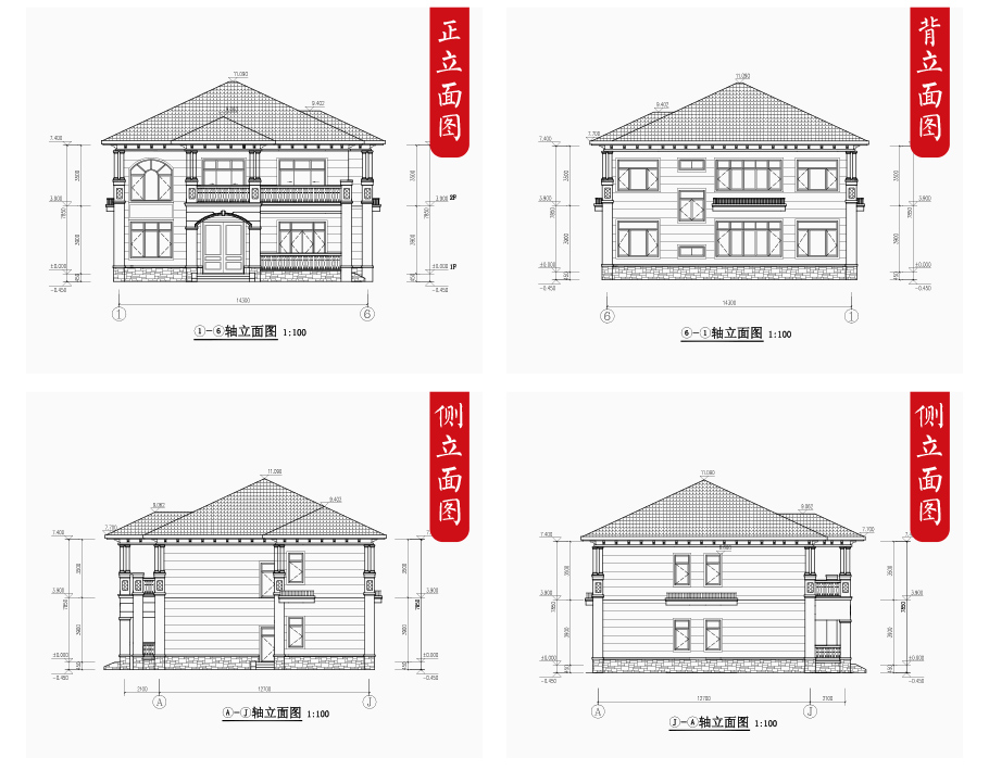 建筑立面圖:東立面圖,西立面圖,南立面圖,北立面圖,剖面圖;