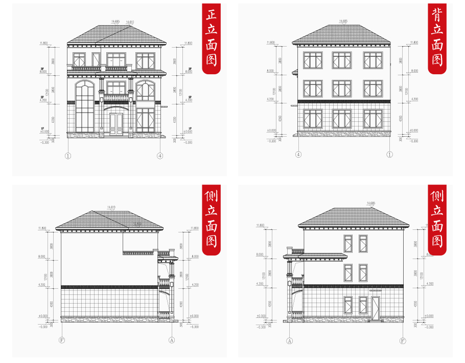 建筑立面圖:東立面圖,西立面圖,南立面圖,北立面圖,剖面圖;