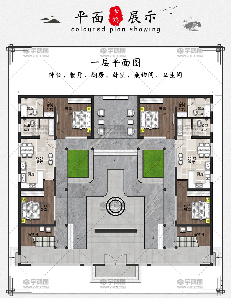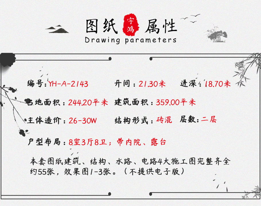 風格:中式 | 層數:二層 | 結構形式:磚混結構 | 圖紙編號:YH-A-2143 |