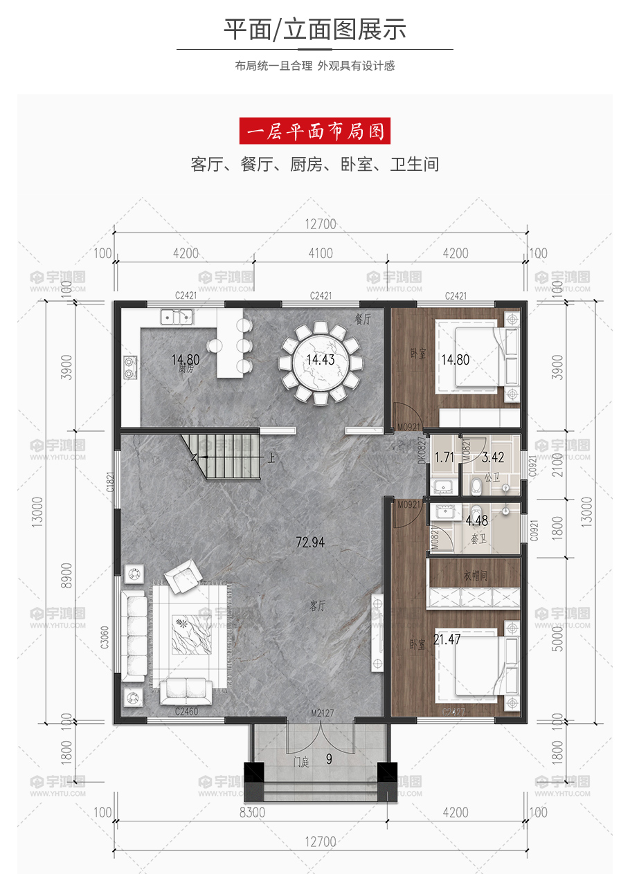 開間:12.7米 | 進(jìn)深:13米 | 占地面積:165.1平方米 | 建筑面積:299.9平方米 |