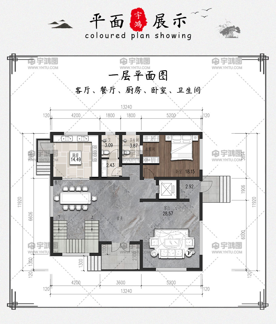 開間:13.24米 | 進深:11.92米 | 占地面積:153.9平方米 | 建筑面積:564.1平方米 |
