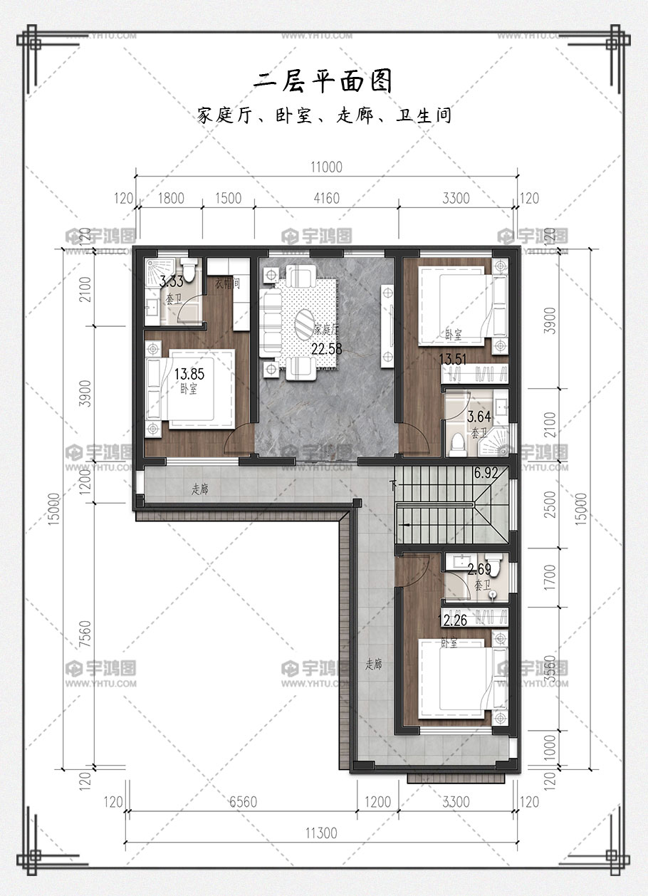 開間:11米 | 進深:15米 | 占地面積:117.7平方米 | 建筑面積:263.2平方米 |
