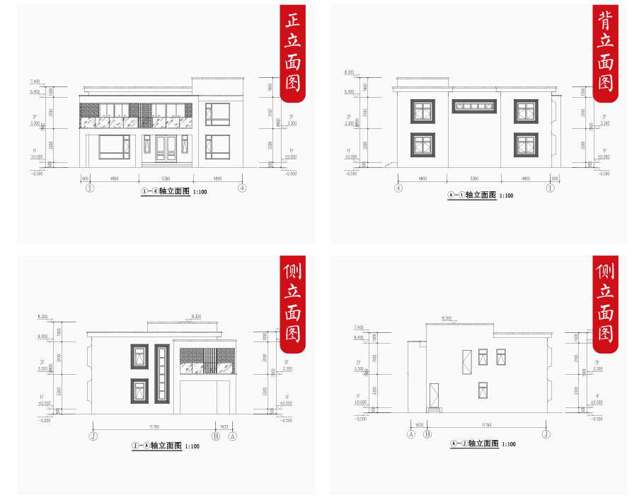 建筑圖: | 建筑平面圖:一層平面圖,二層平面圖; 建筑立面圖:東立面圖,西立面圖,南立面圖,北立面圖,剖面圖; 大樣圖:樓梯詳圖,細部大樣,門窗大樣 |