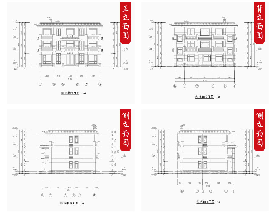 建筑立面圖:東立面圖,西立面圖,南立面圖,北立面圖,剖面圖;