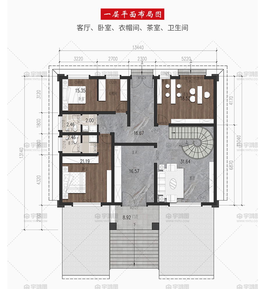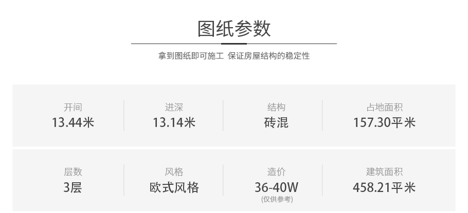 開間:13.44米 | 進深:13.14米 | 占地面積:157.3平方米 | 建筑面積:458.21平方米 |