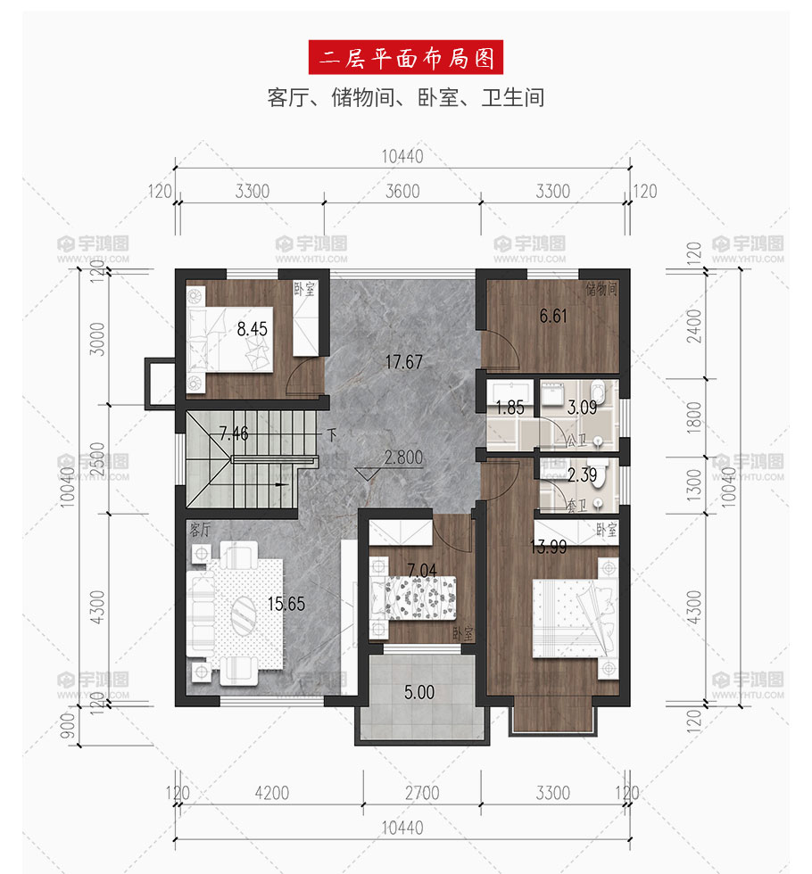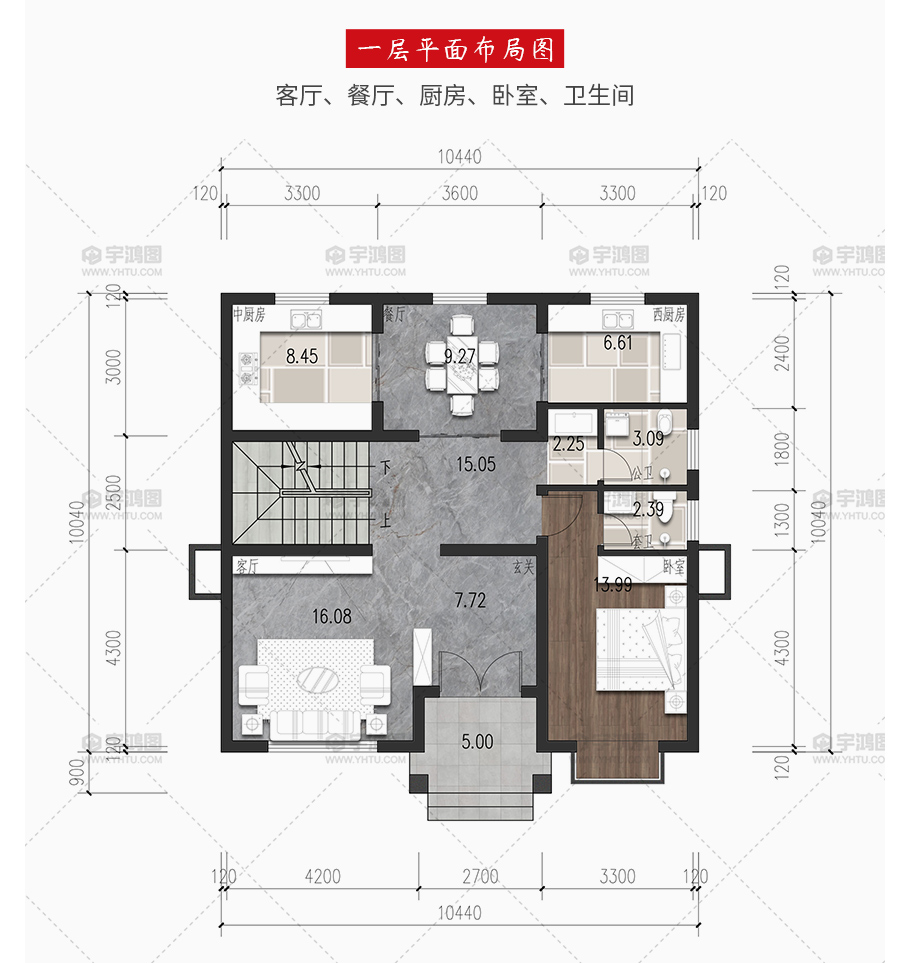 開間:10.44米 | 進(jìn)深:10.04米 | 占地面積:107平方米 | 建筑面積:226.17平方米 |