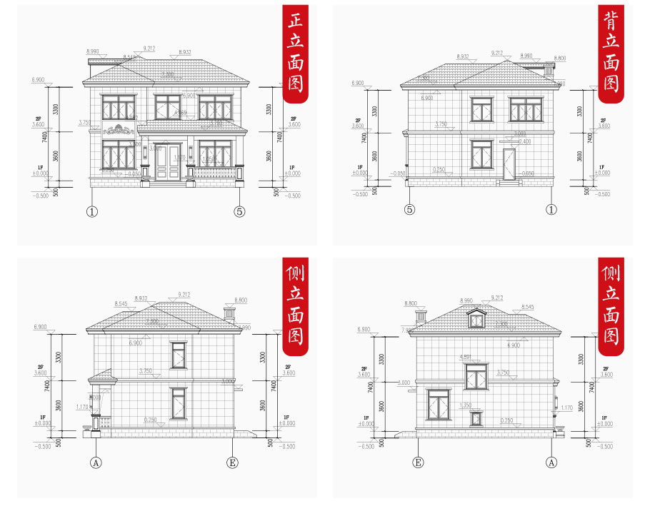 建筑圖: | 建筑平面圖:一層平面圖,二層平面圖; 建筑立面圖:東立面圖,西立面圖,南立面圖,北立面圖,剖面圖; 大樣圖:樓梯詳圖,細部大樣,門窗大樣 |