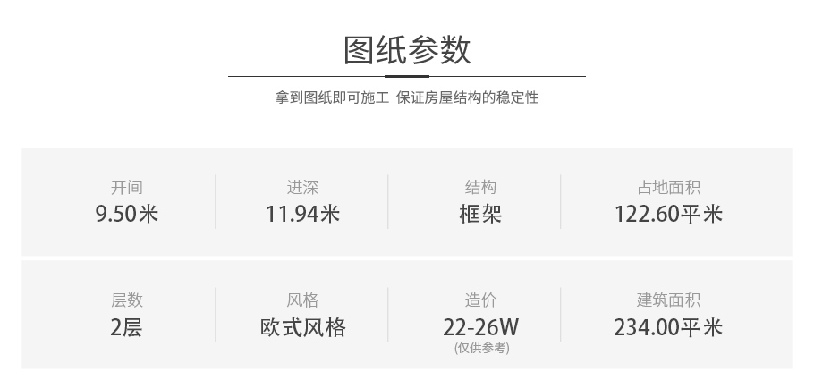 開間:9.5米 | 進深:11.94米 | 占地面積:122.6平方米 | 建筑面積:234平方米 |