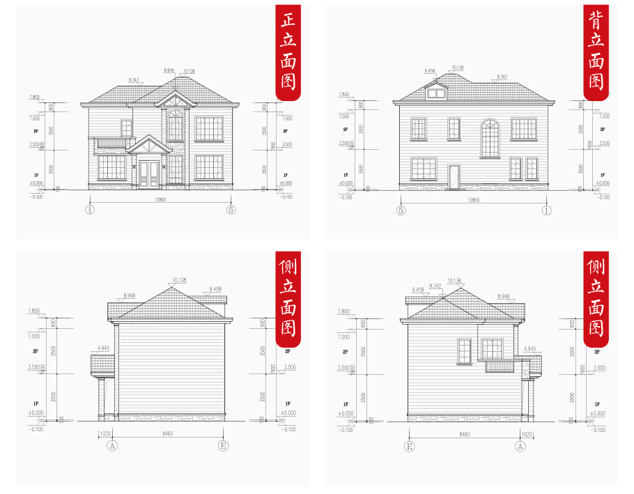 建筑圖: | 建筑平面圖:一層平面圖,二層平面圖; 建筑立面圖:東立面圖,西立面圖,南立面圖,北立面圖,剖面圖; 大樣圖:樓梯詳圖,細部大樣,門窗大樣 |