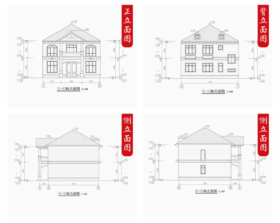 建筑圖: | 建筑平面圖:一層平面圖,二層平面圖; 建筑立面圖:東立面圖,西立面圖,南立面圖,北立面圖,剖面圖; 大樣圖:樓梯詳圖,細部大樣,門窗大樣 |