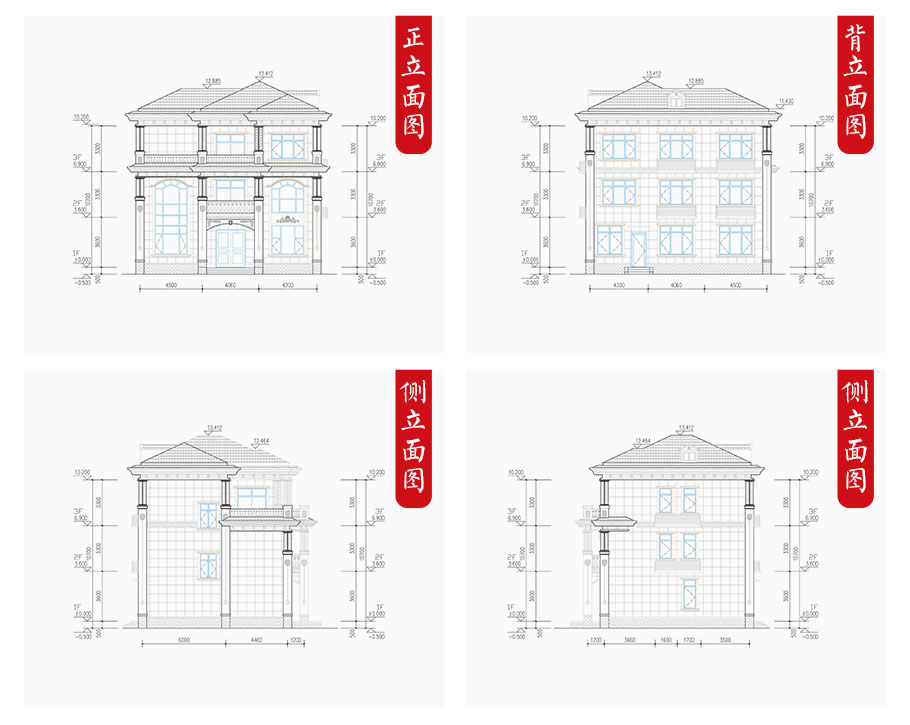 建筑平面圖:一層平面圖,二層平面圖,三層平面圖; 建筑立面圖:東立面圖,西立面圖,南立面圖,北立面圖,剖面圖; 大樣圖:樓梯詳圖,細部大樣,門窗大樣 |