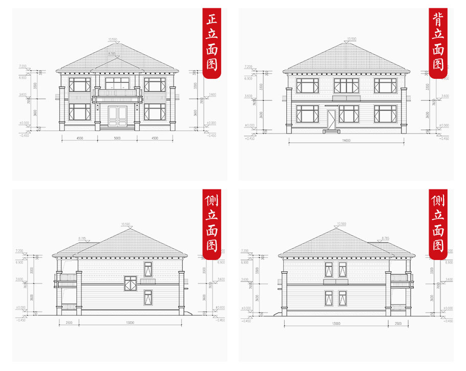 建筑圖: | 建筑平面圖:一層平面圖,二層平面圖; 建筑立面圖:東立面圖,西立面圖,南立面圖,北立面圖,剖面圖; 大樣圖:樓梯詳圖,細部大樣,門窗大樣 |