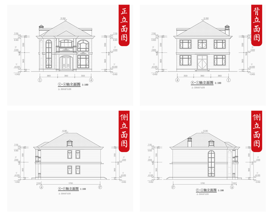 建筑圖: | 建筑平面圖:一層平面圖,二層平面圖; 建筑立面圖:東立面圖,西立面圖,南立面圖,北立面圖,剖面圖; 大樣圖:樓梯詳圖,細部大樣,門窗大樣 |