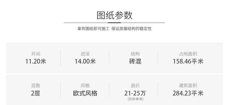 開間:11.2米 | 進深:14米 | 占地面積:158.46平方米 | 建筑面積:284.23平方米 |
