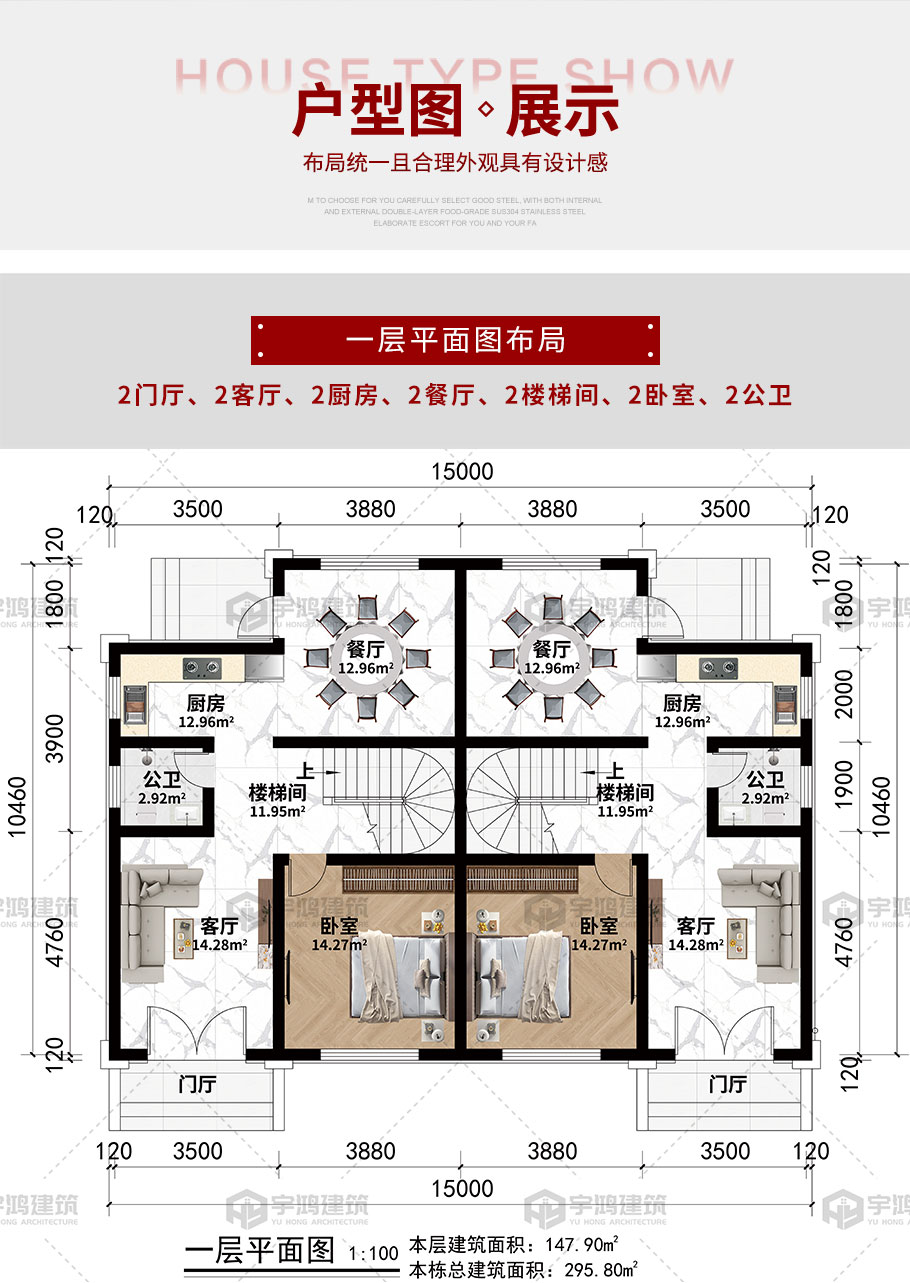 開間:15米 | 進深:10.46米 | 占地面積:147.9平方米 | 建筑面積:295.8平方米 |