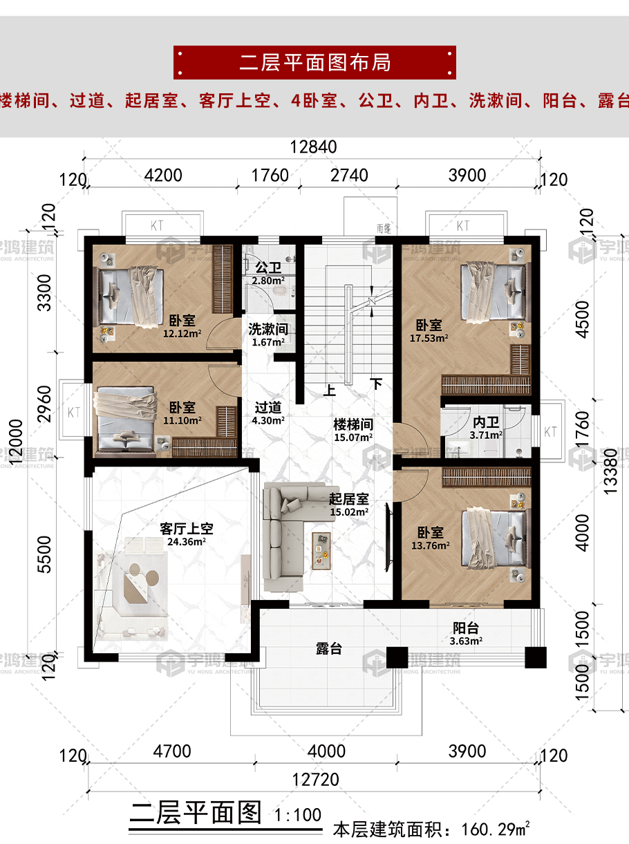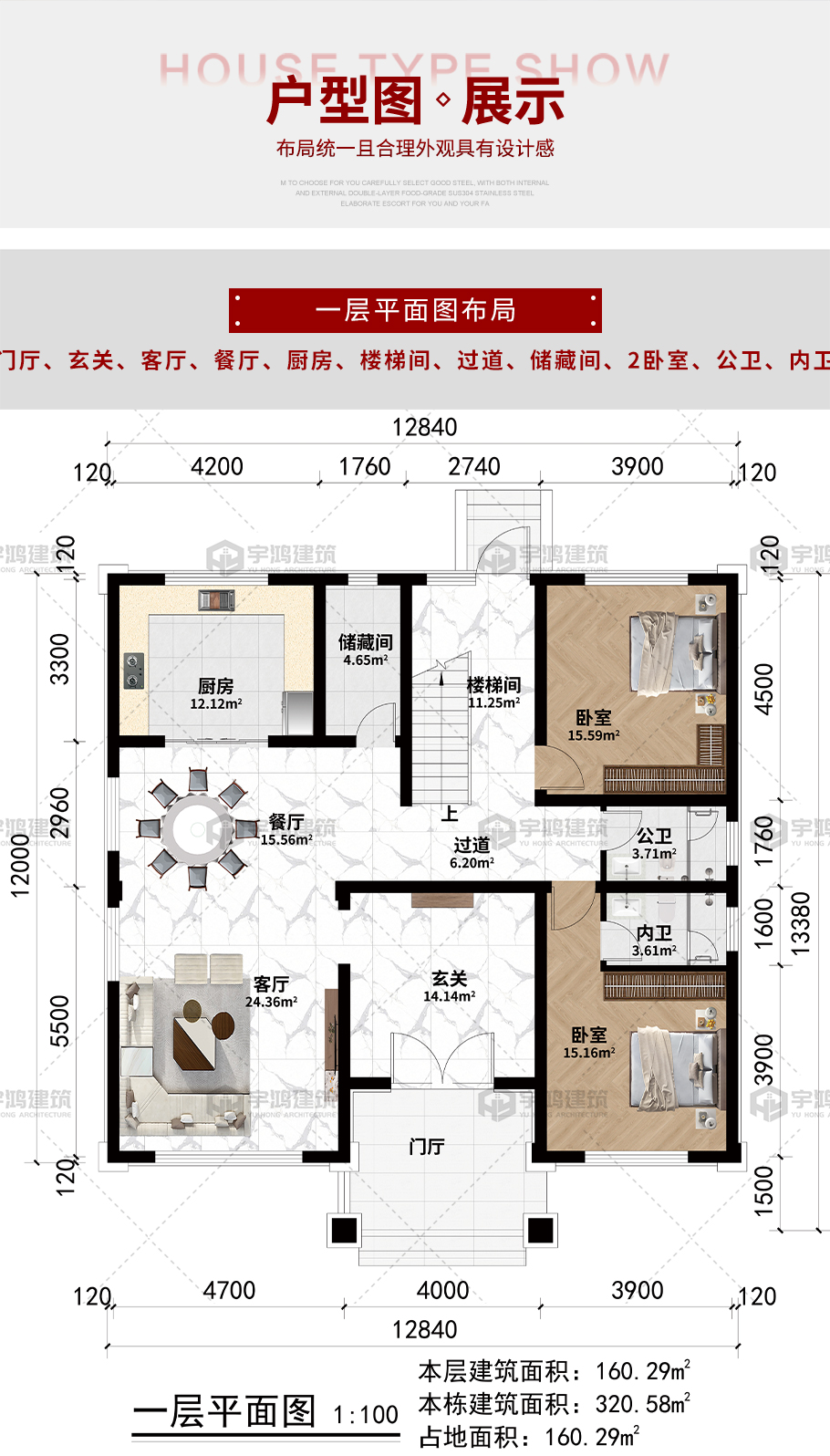 開間:12.84米 | 進深:13.38米 | 占地面積:160.29平方米 | 建筑面積:320.58平方米 |