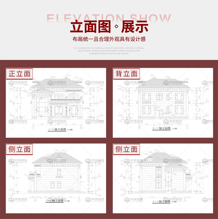 建筑圖: | 建筑平面圖:一層平面圖,二層平面圖; 建筑立面圖:東立面圖,西立面圖,南立面圖,北立面圖,剖面圖; 大樣圖:樓梯詳圖,細部大樣,門窗大樣 |