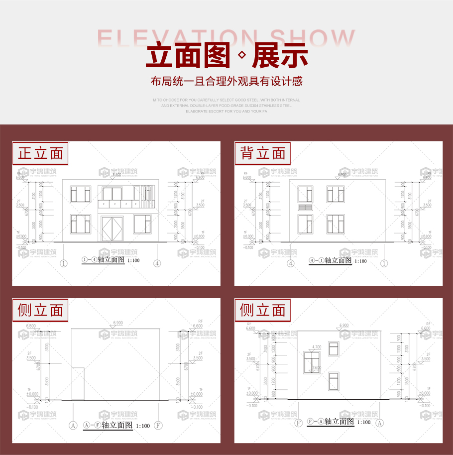 建筑平面圖:一層平面圖,二層平面圖; 建筑立面圖:東立面圖,西立面圖,南立面圖,北立面圖,剖面圖; 大樣圖:樓梯詳圖,細(xì)部大樣,門窗大樣 |