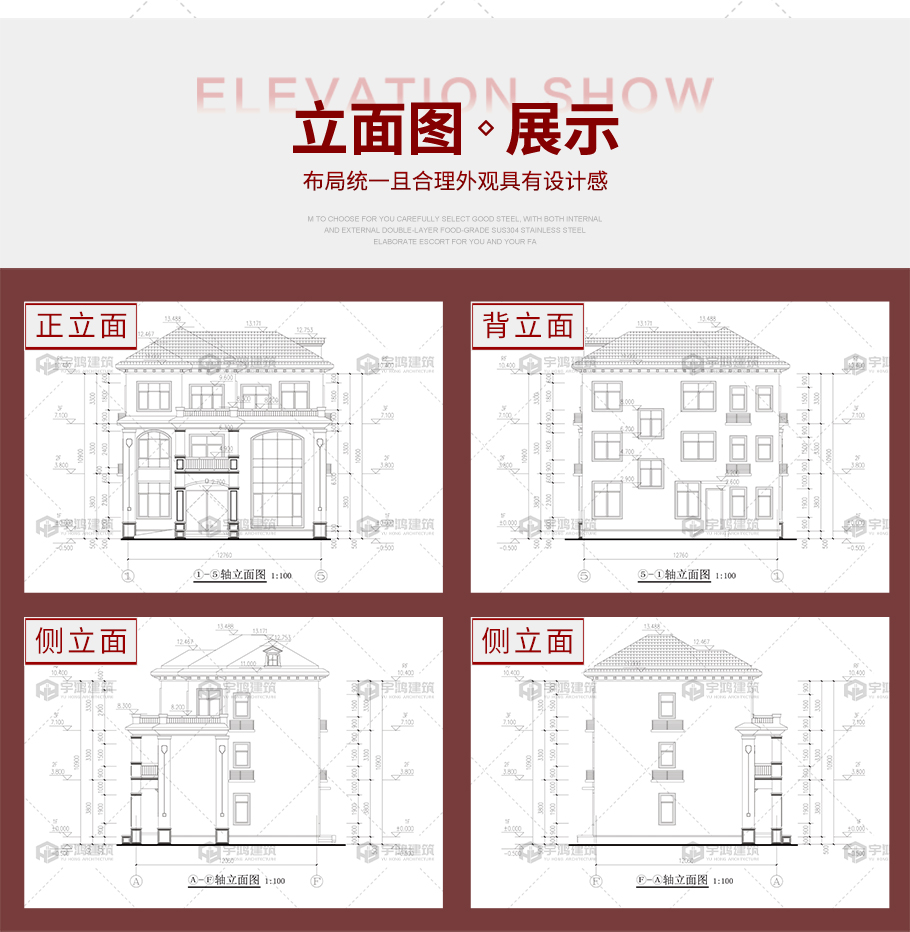建筑圖: 建筑平面圖:一層平面圖,二層平面圖,三層平面圖; 建筑立面圖:東立面圖,西立面圖,南立面圖,北立面圖,剖面圖; 大樣圖:樓梯詳圖,細部大樣,門窗大樣