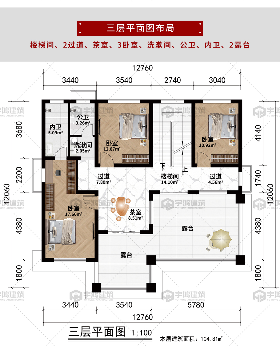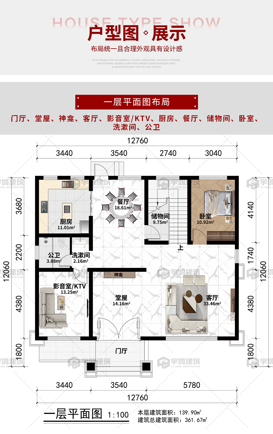 開間:12.76米 進深:12.06米 占地面積:139.9平方米 建筑面積:361.67平方米