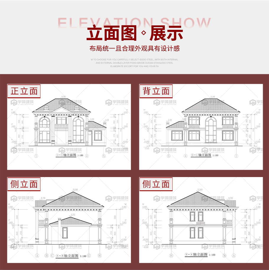 建筑圖: | 建筑平面圖:一層平面圖,二層平面圖; 建筑立面圖:東立面圖,西立面圖,南立面圖,北立面圖,剖面圖; 大樣圖:樓梯詳圖,細(xì)部大樣,門窗大樣 |