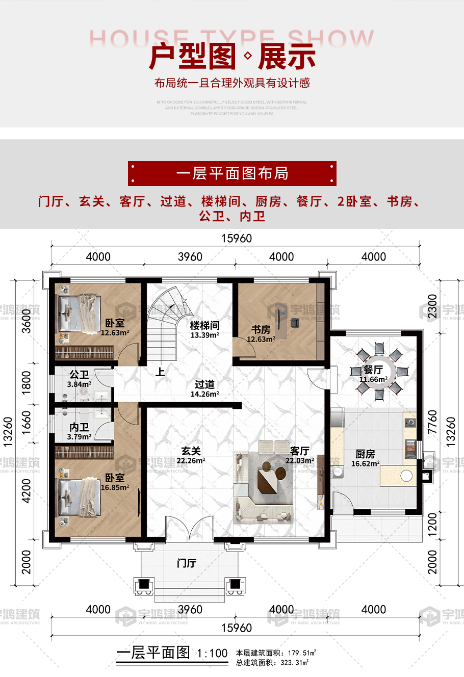 開間:15.96米 | 進(jìn)深:13.26米 | 占地面積:187.31平方米 | 建筑面積:323.31平方米 |