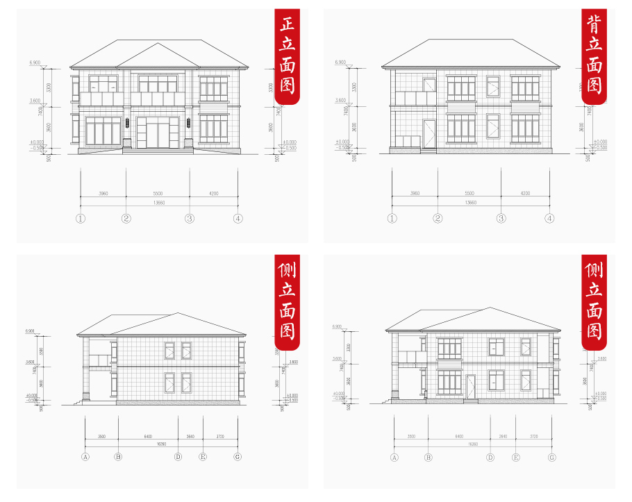 建筑圖: | 建筑平面圖:一層平面圖,二層平面圖; 建筑立面圖:東立面圖,西立面圖,南立面圖,北立面圖,剖面圖; 大樣圖:樓梯詳圖,細(xì)部大樣,門(mén)窗大樣 |